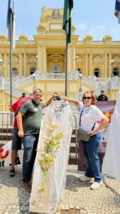 Convidada pelos organizadores para subir no carro de som, a primeira Tesoureiro do SindenfRJ, Mônica Armada, disse que, se hoje o Governo do Estado presta algum tipo de serviço para a população, isso se dá graças ao empenho e à dedicação dos servidores públicos. Ela fez questão de lembrar que, enquanto promovia o achatamento dos salários, o governador, de acordo com a imprensa, desviava recursos do Rioprevidência para aplicar no Banco Master de Daniel Vorcaro. Durante a caminhada, os manifestantes também fizeram questão de salientar que Castro será julgado no Tribunal Superior Eleitoral (TSE) nos próximos dias 24 e 25 e poderá ser cassado. O SindenfRJ vai acompanhar esse julgamento com bastante interesse, torcendo para que haja cassação e que o novo governador seja mais sensível às causas do funcionalismo estadual.
