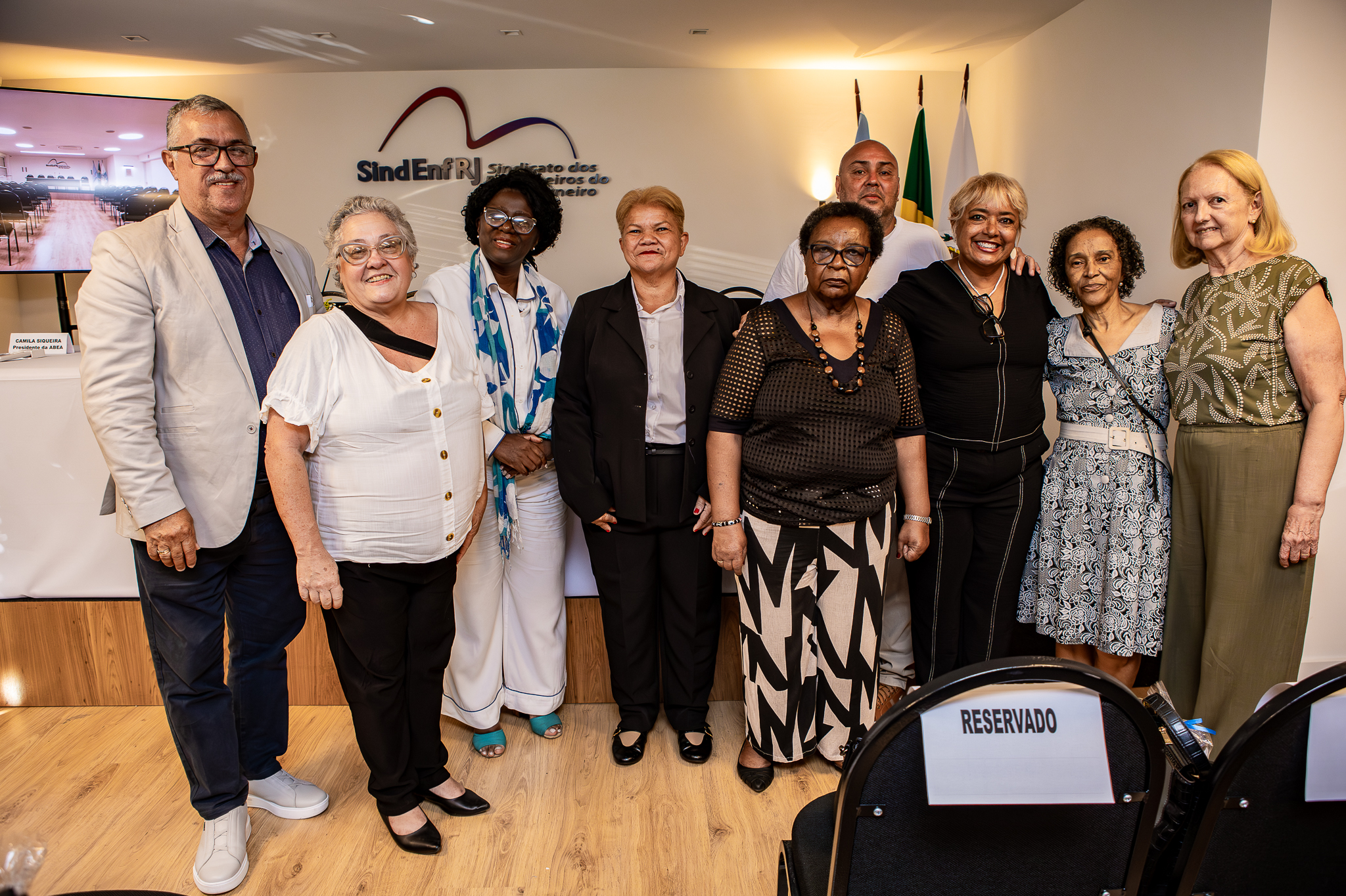 A mesa de cerimônia da inauguração mostrou a potência da importância deste evento tão representativo para a Enfermagem. Além da presidente Elizabeth Guastini, compuseram o grupo as deputadas federais Benedita da Silva (PT) e Enfermeira Rejane (PCdoB); o presidente da Central Única do Trabalhadores do Rio (CUT-RJ), Sandro César; a presidente da Associação Brasileira de Enfermeiros Auditores (Abea), Camila Siqueira; a vice-presidente da Associação Brasileira de Enfermagem (Aben), Sônia Maria Alves; a vice-presidente do Conselho Regional de Enfermagem do Rio (Coren-RJ), Rosimere Maria da Silva; e a ex-presidente do SindenfRJ, Ieda da Costa Barbosa. Por causa de um imprevisto, a representante da Federação Nacional de Enfermagem (FNE) não pode comparecer.